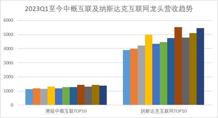 纳斯达克方面,2023年第一季度其互联网前十大企业整体营收规模约3900亿美元,过去三年最佳表现达5520亿美元。
