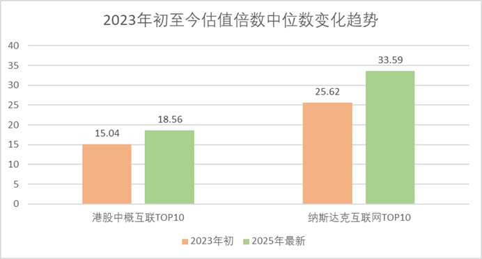 三年过去,港股中概互联的估值中位数从15倍升至18–19倍左右,与市场整体趋势一致,变化幅度不大。