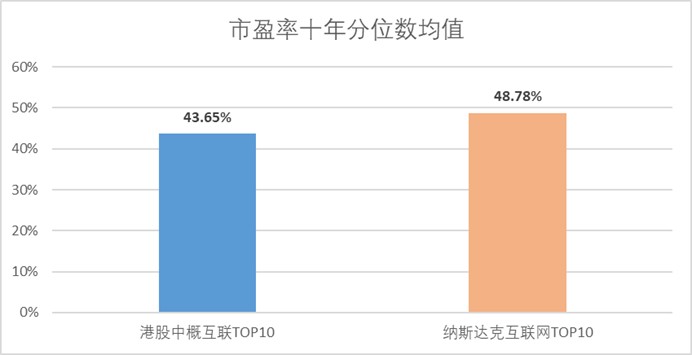 从趋势看,至少中概互联龙头与纳斯达克互联网龙头均处于估值上修通道中。从历史百分位来看,港股中概互联的十年分位数与纳斯达克龙头企业的分位数差距不大,均处于40%–50%区间。