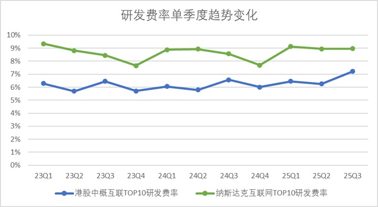 港股互联网巨头的研发费率长期稳定在6%左右,今年第三季度因AI投资增加明显抬头,突破7%,两者差距正在逐渐收窄。