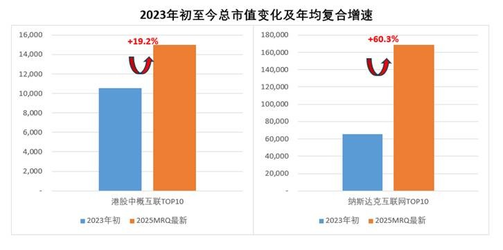 AI纪元初期(2023年初),港股中概互联样本内前十大龙头企业的总市值约10500亿美元,目前最新总市值约15000亿美元,年复合增长率约19.2%。