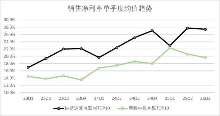 但截至最新三季度数据,中概互联前十大整体净利率为19.6%,纳斯达克整体净利润率达27.4%,两者已拉开明显差距。