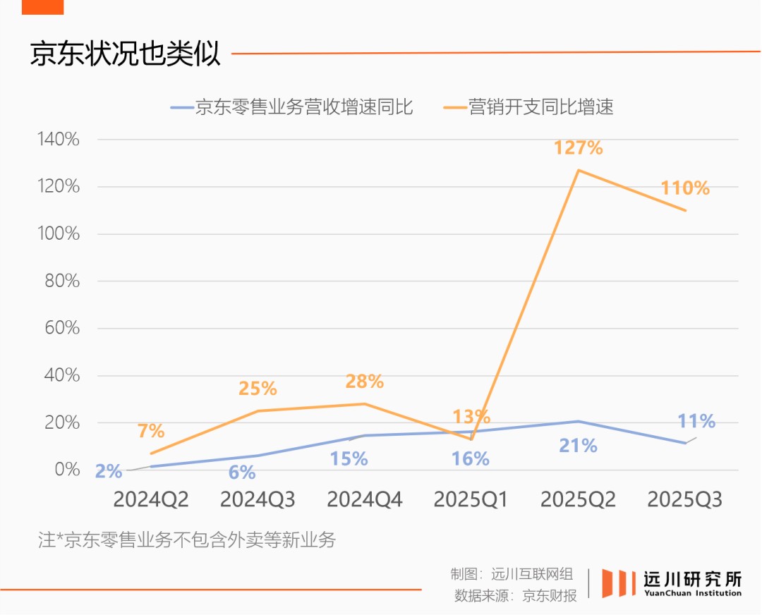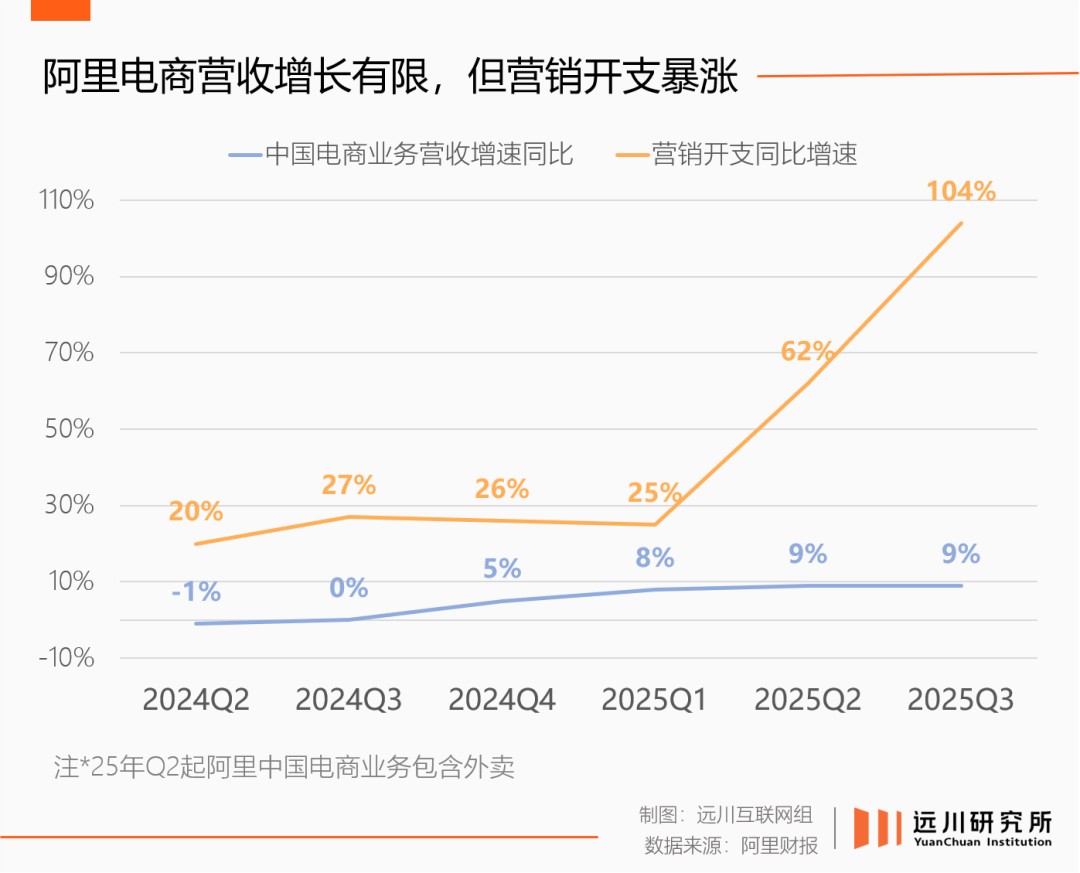 电商收入增速几乎原地踏步,阿里将闪购打包进中国电商板块,整体增速也才9%;京东在刚参战的二季度,把零售增速拉上20%,转眼三季度就已转跌10%[3][4]。