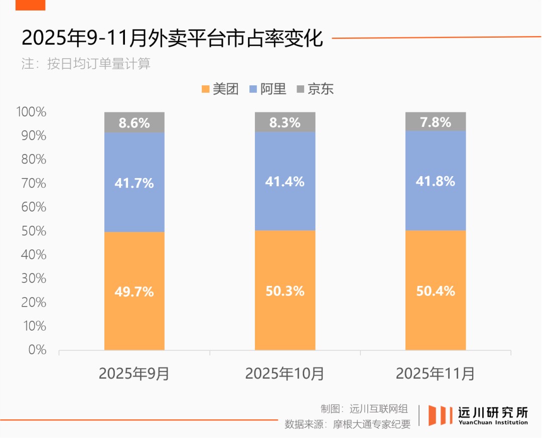 外卖市场多年的寡头格局开始松动。2024年美团外卖市占率在65%左右[7],今年下滑近两成。