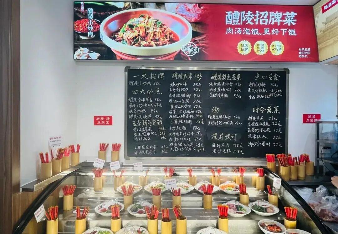 且食材新鲜、价格实在。在小苗哥下饭菜、陈兰湘等品牌门店中,还设置了专门的点菜区域——各类食材都切好、洗净摆放整齐,旁边还放置了竹筒,里面有标签写好食材的名称和价格等,顾客挑选好直接送到后厨加工。这也满足了当下消费者“不想做饭,但要吃得放心”的需求。