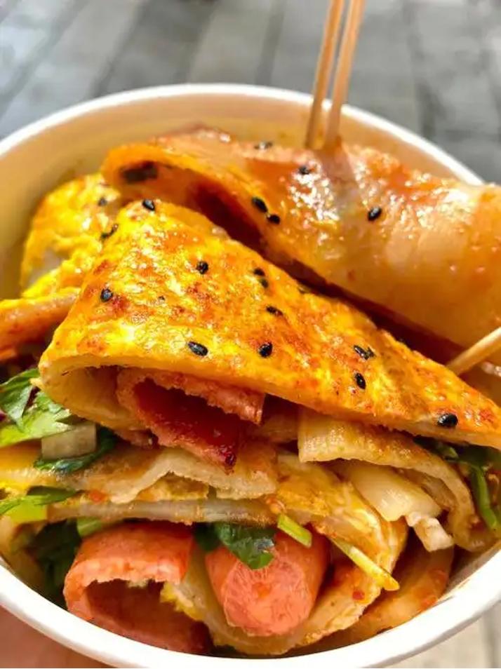 鸡蛋洋葱香菜的基础配置让烤冷面颜色更丰富,在提升客单价的同时也彻底地去地域化了。此外,和传统版本相比,现代版烤冷面对制作者的要求降到了最低限度,在预制菜概念尚未流行的时代,烤冷面已率先完成了核心原材料的预制化。