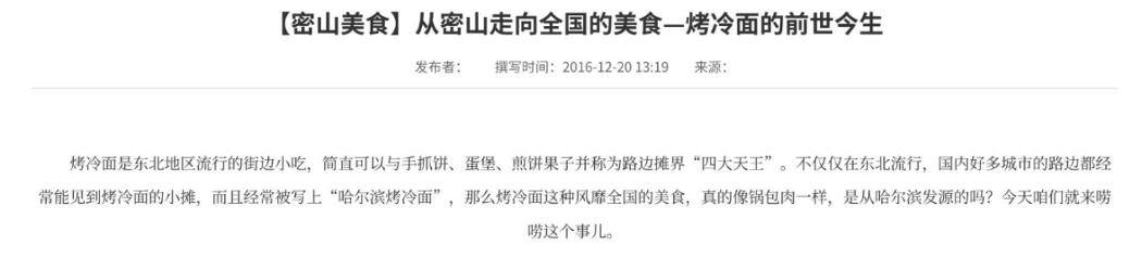 对于烤冷面的起源,一种普遍的说法为1996年起源于黑龙江省鸡西市密山市,密山市官方媒体账号最先出来认证并定论。在维基百科里,烤冷面的定义为发源自中国黑龙江省的街头小吃。