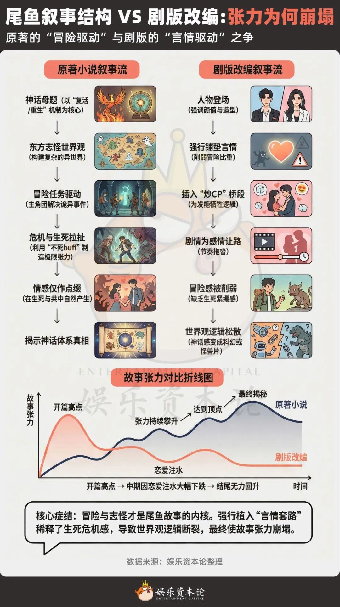 当然,比起“被男凝”的尾鱼女主们,真正让阿水困惑的,其实是尾鱼IP为什么总在改编过程中被推往“言情之路”。尾鱼宇宙的底层结构根本不是情感驱动,而是东方奇诡体系下的冒险驱动,它们都绕着同一个神话“母题”展开:女主可以重生。