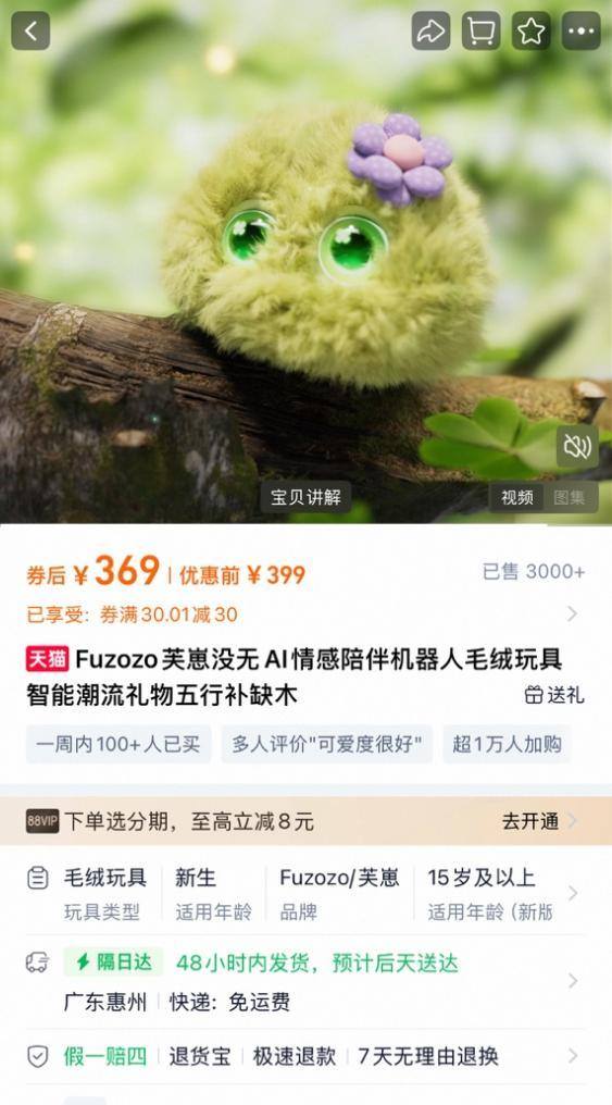 从去年8月开售到现在,「BubblePal」已卖出将近30万台。电商平台上,每件日常价格在350-400元间浮动,总销售额超过1亿元。在全球AI玩具总销量尚不超过100万台的当下,稳居全球销量榜首。