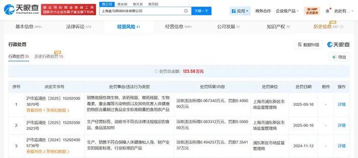 2025年9月16日,盒马因销售致病性微生物、农药残留…等危害人体健康的物质含量超过食品安全标准限量的食用农产品被上海浦东新区市场监督管理局罚款4000元。