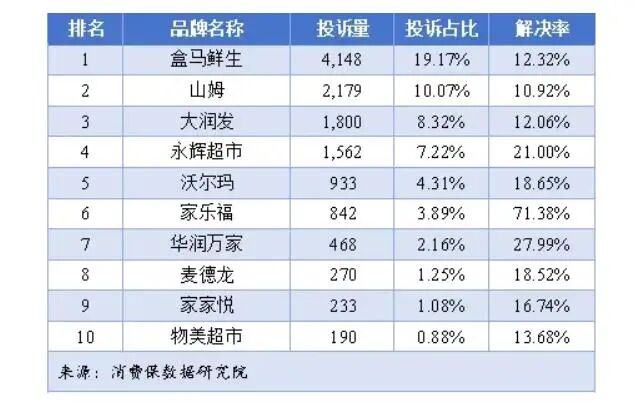 据消费电子杂志社报道,来自消费保数据研究院的数据统计,在主要商超品牌投诉中,盒马鲜生的投诉量为4,148件,占比为19.17%,排投诉榜第一;山姆以2179件、10.07%的投诉占比高居第二,大润发以1800件,8.32%的投诉占比位居第三。