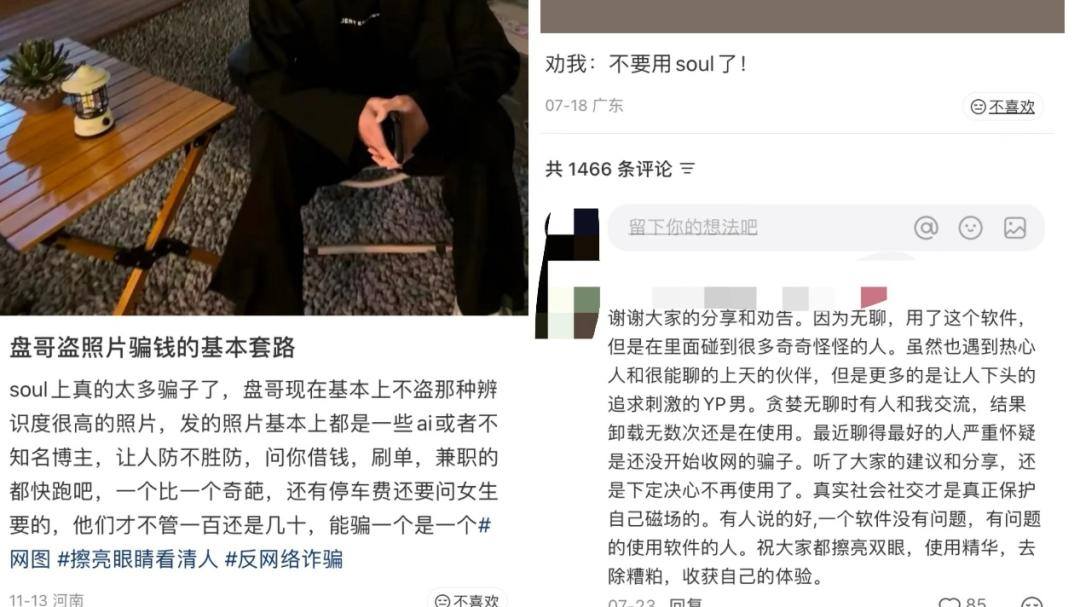 此后,在小红书、微博等平台上,也有不少网友提到自己在Soul上遇到了骗子。其中有网友发布笔记称,“soul上真的太多骗子了……一个比一个奇葩。”
