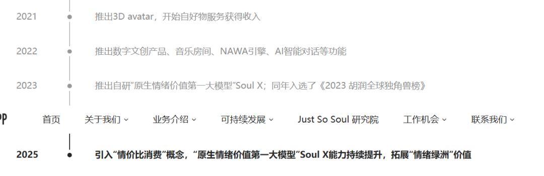 而在Soul的官网,AI含量也很高。从2023年起,Soul就提出了“AI+沉浸式社交”新范式。而如今,在其官网首页,其强调,Soul的“AI大模型”能随时随地提供“情绪价值”,让你和懂自己的人即时互动,或者和“超有活人感”的AI伙伴敞开心扉。