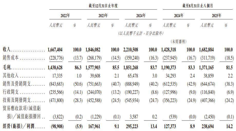 从具体财务表现来看,招股书显示,2022年至2024年,公司营收分别为16.67亿元、18.46亿元和22.11亿元,三年复合增长率超15%。更关键的是,Soul已实现从长期亏损到稳定盈利的转折,2023年盈利为3.61亿元,2024年盈利为3.37亿元,2025年前8个月已达2.86亿元。