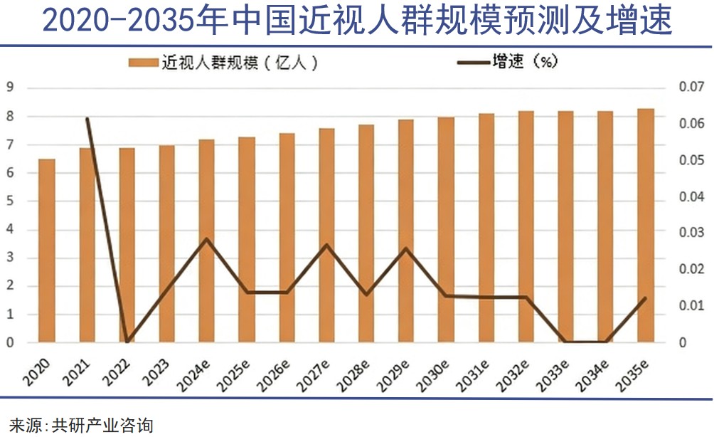 该报告在2023年时就预测,中国近视人群比率接近人口的50%,需要佩戴近视眼镜的人群约7亿人,且预测这一数据还在随时间的推移增长。