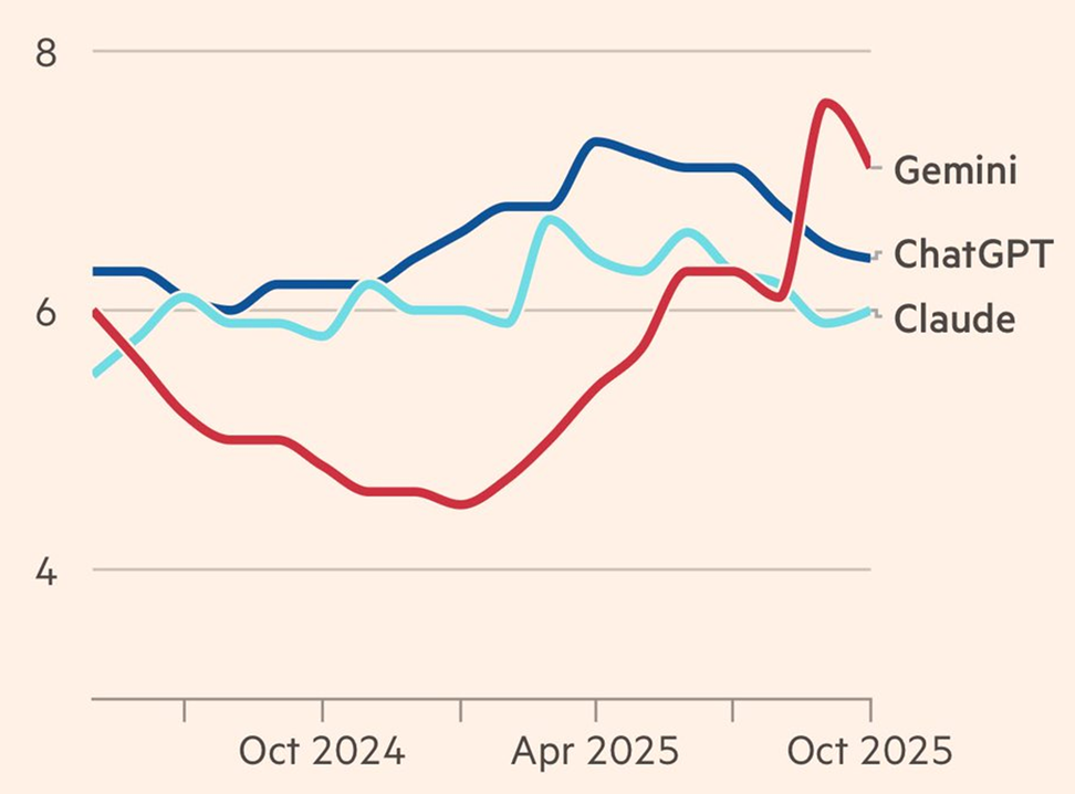 数据也验证了这一点。谷歌Gemini的用户使用时长,已开始超越ChatGPT,位居第一。对OpenAI来说,这是一个很危险的信号。