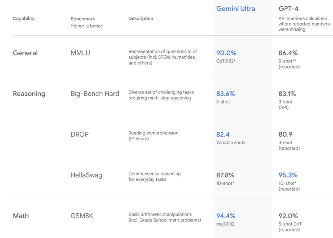 Gemini与OpenAI GPT-4测评数据对照,图源:网络