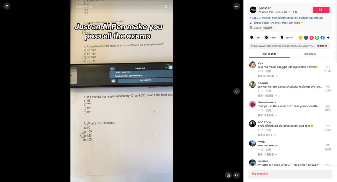 在海外,一款功能类似的设备在 TikTok 上走红,它被称之为“应对纸笔考试的作弊神器”。此前不少海外学校为应对学生过度依赖 AI,重新将纸笔考试引入课堂,当手机里的 App、浏览器里的拓展程序某种程度上失去了用武之地之后,答疑笔开始被一部分“不安分”的学生给予厚望。