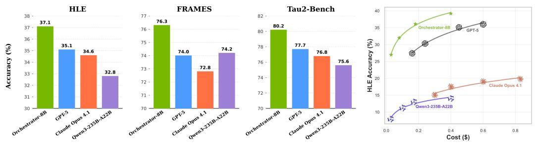 在三大高难度基准上,Orchestrator-8B全面超越现有方法且显著降低推理成本: