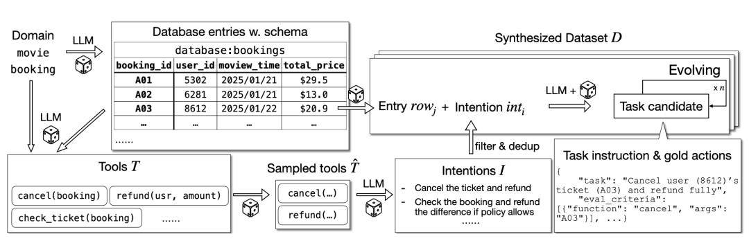 作为首个大规模、可验证的多轮工具调用合成数据集:ToolScale通过大模型自动构建10个领域(金融、医疗、航空等)的模拟环境(含数据库+工具API),再生成43万条含人工标记的最佳工具调用轨迹的任务。
