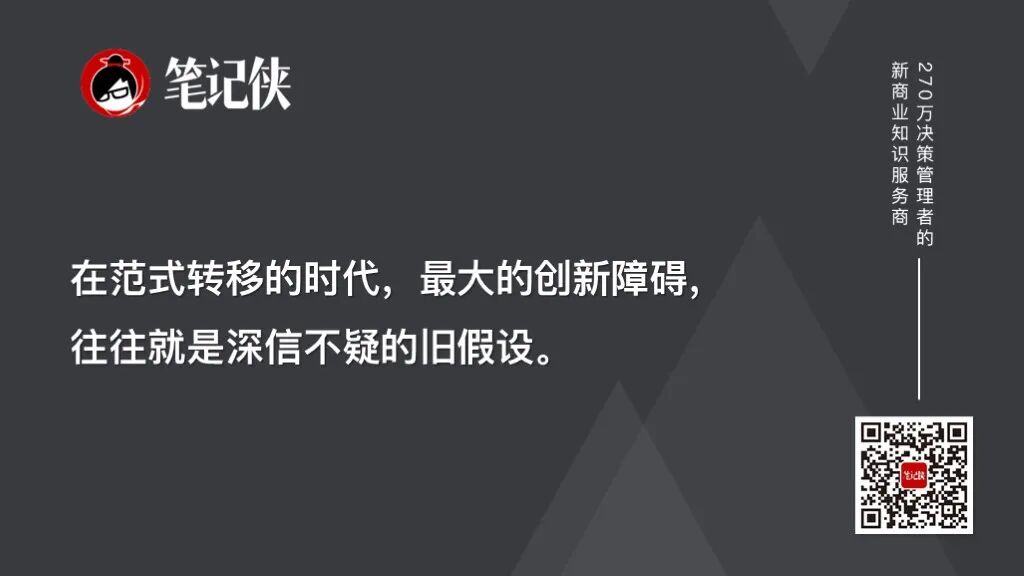 哲学家兼交易员塔勒布在《黑天鹅》中对此进行了深刻的批判。 在范式转移的时代,最大的创新障碍,往往就是我们深信不疑的旧假设。