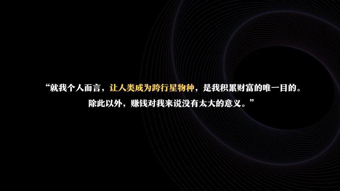 马斯克的新理念是超越商业,从生命尺度思考使命。他说过的一句话经常让我热泪盈眶:“对我而言,让人类成为跨行星的物种,这是我赚钱积累财富的唯一目的。除此以外,金钱对我没有任何意义。”