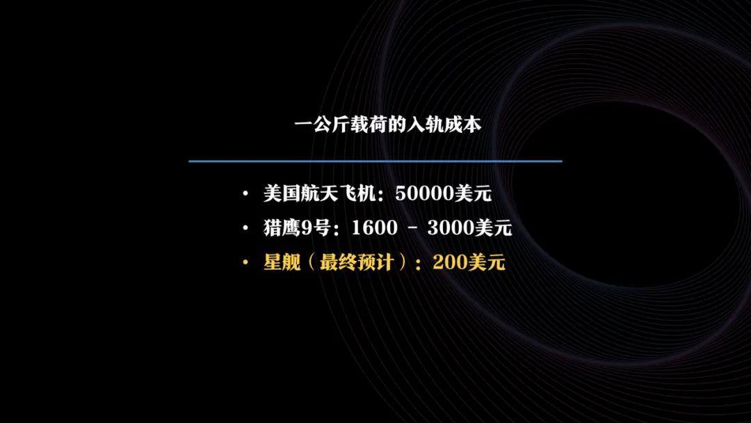 目前,美国航天飞机入轨成本每公斤5万美元,SpaceX的猎鹰九号约3000美元,未来的星舰预计降至200美元,星舰将在猎鹰九号基础上再降90%。这是真实的十倍速差距。
