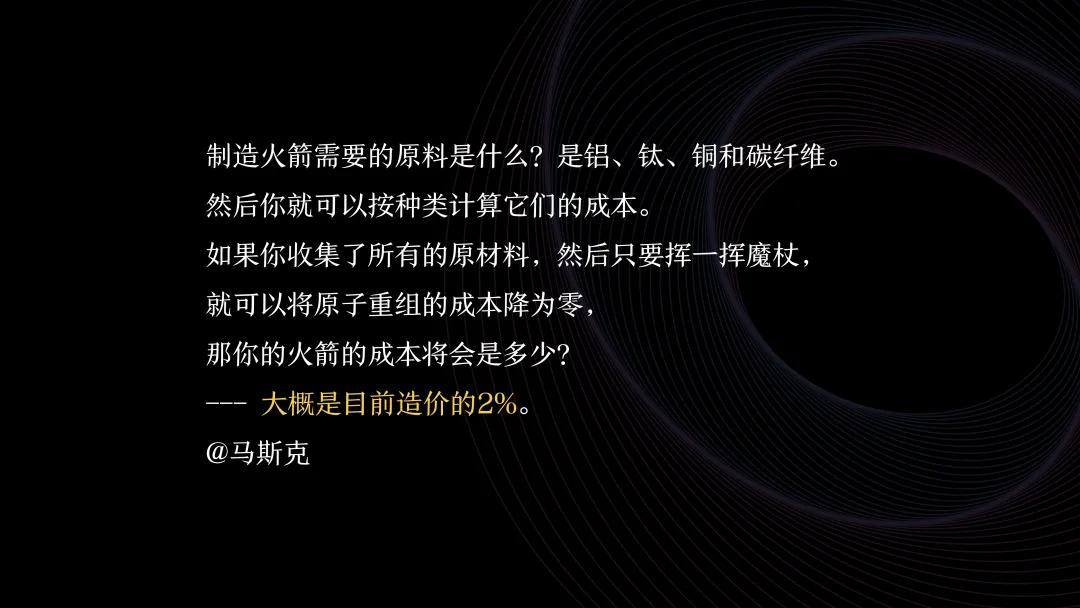 我们先从“火箭”这个词说起。维特根斯坦认为语言蕴含人类潜意识,当我们想到烟花或火箭时,都会联想到一次性使用。但马斯克受科幻小说启发,提出火箭可重复使用的新技术假设。如果基于这个假设,火箭会变成什么呢?我们来分析一下。