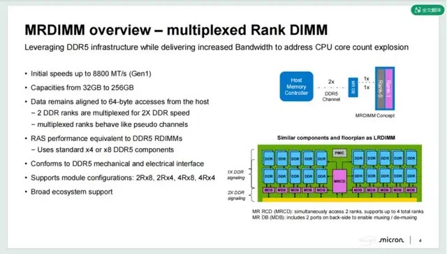 美光在2024年,全面推出了MRDIMM,提供从32GB至256GB的广泛容量选项;三星公布了其MRDIMM产品方案,该方案通过结合两个DDR5组件,实现了现有DRAM组件带宽的翻倍,提供高达8.8Gb/s的数据传输速率。