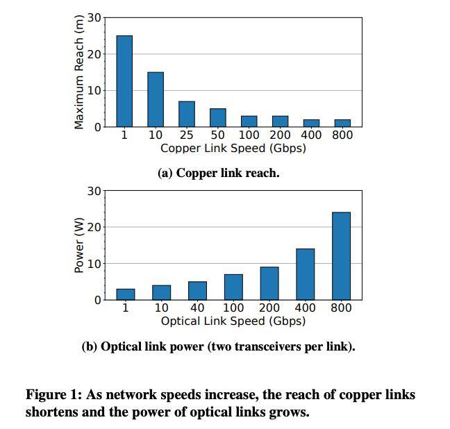 随着传输速率增加,铜缆有效距离逐渐缩短(a)、光纤功耗逐渐增加(b)