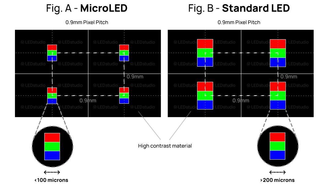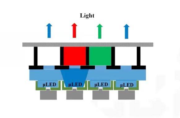 Micro LED 在同样的像素间距下,像素尺寸更小、排列更密集
