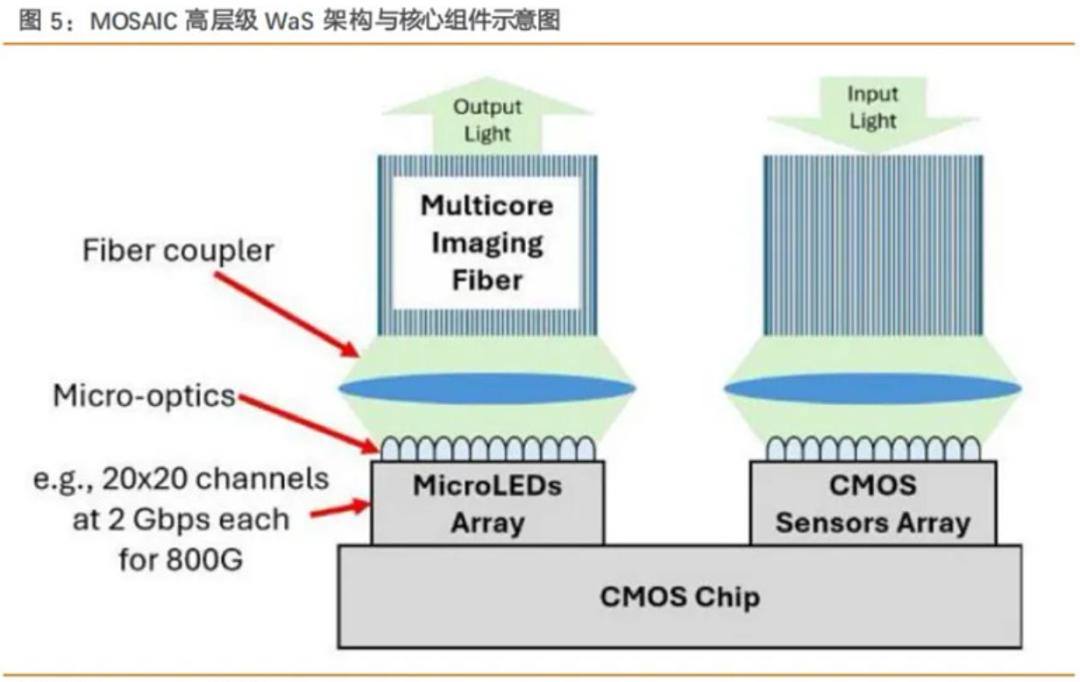 MOSAIC 就规定,不需要像传统光纤通信那样,把单通道卷到 50 Gb/s、甚至 100 Gb/s 的超高速率,每个 MicroLED 像素可以摸摸鱼,只跑 2 Gb/s 的 “低速率” 。