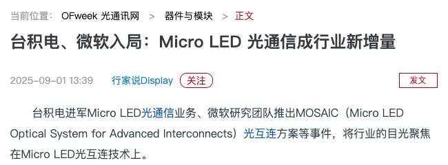 是这样的,前阵子托尼在网上刷到这样一条新闻,说微软正在研究通过 Micro LED 光互联技术(MOSAIC),来解决算力中心的数据传输,被 “卡脖子” 的问题。