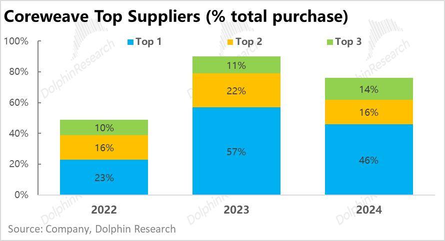 那么从逻辑上看,CoreWeave在向上游供应链的议价能力上又是否出色?简单来说,并不好。首先三家运营商就占公司总采购额的8~9成,这一点就意味着一旦某家大供应商停止供货就足以对公司的供应链产生巨大冲击。