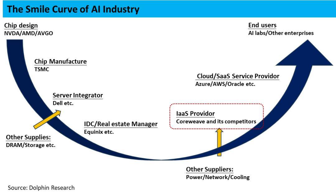 下图概括性的展示了整个云服务从上游到下游的产业链,如著名的“微笑曲线”,海豚君认为在算力产业链中的两端——更靠上游设计和更靠下游接触终端用户的部分是产业链中议价能力相对更强的。