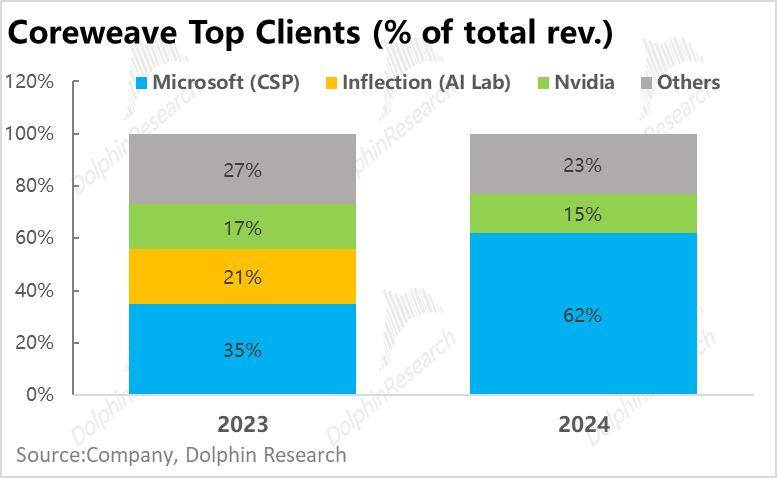 在2024财年CoreWeave约$19亿的总营收中,接近80%的收入只来自两家客户公司——微软和英伟达,其中微软一家就占了当年总收入的62%。