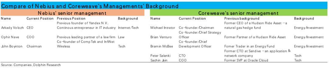 相比之下,据悉公司在新云领域内主要的竞争对手之一—Nebius则在软件/编程能力上更有优势。作为一个侧面的证据,从两家公司的创始人和核心管理层的不同背景,也能对两家公司不同的导向窥见一二。