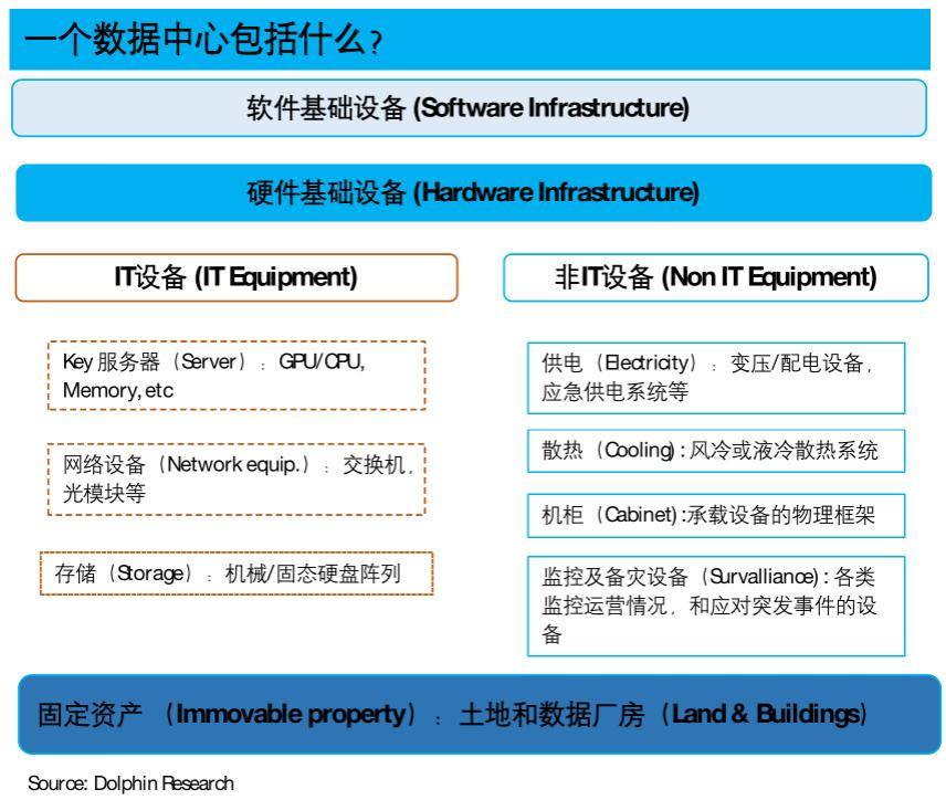 2) 第二层——IT类设备:在土地&库房的基础上,支撑起一个数据中心的第二层是各类的硬件设备,首先是与提供算力直接相关的各类IT设备,包括: