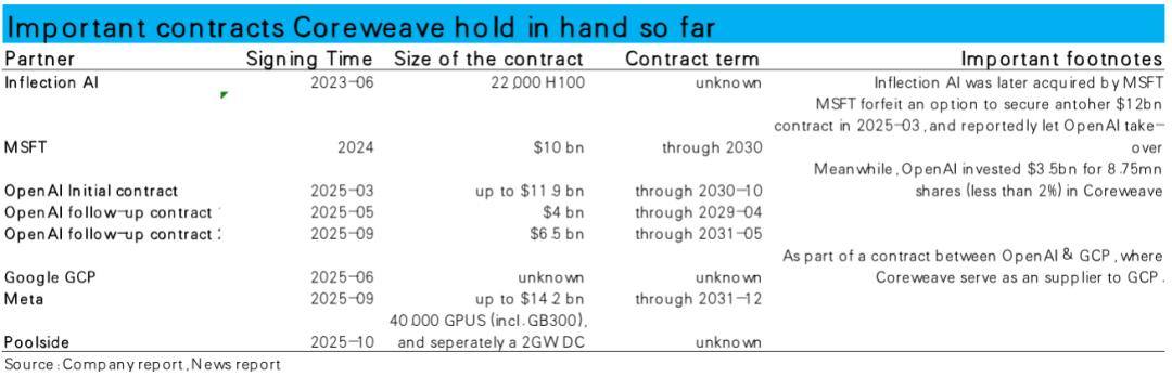 更“实时反映现状”的在手合约月同样呈现用户集中的现状:在3Q25披露的$556亿未履约合同余额中,来自OpenAI,微软和Meta这三家的合约金额就接近$470亿。