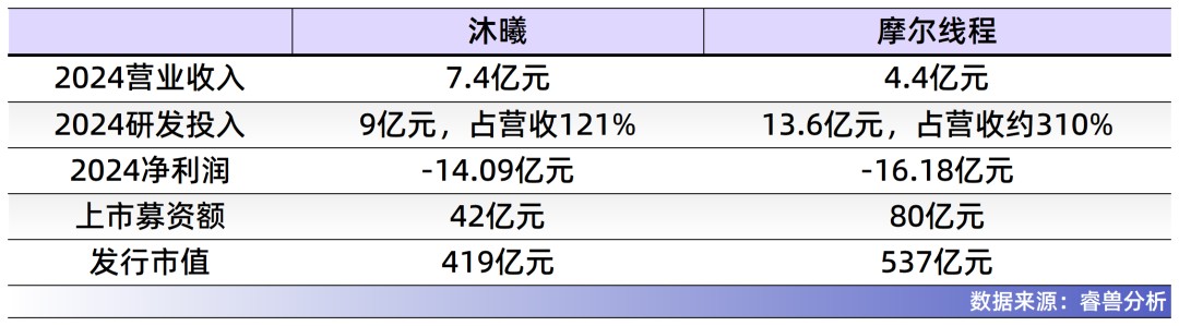 不过,沐曦在研发投入和募资规模上更低,2022~2024年,沐曦累计研发投入22.47亿元,摩尔线程的同期研发投入是它的1.7倍,沐曦在本轮科创板IPO募资42亿元,摩尔线程募资额是它的2倍。