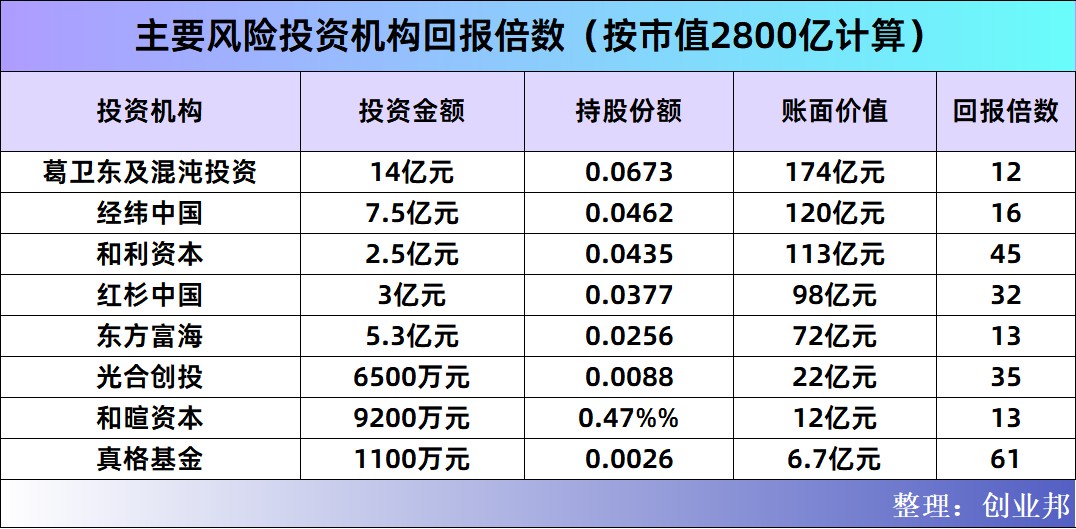 按照市值2600亿元计算,葛卫东及混沌投资合计投资约14亿元,股权价值174亿元,回报倍数12倍;经纬创投合计投资超7.5亿元,股权价值120亿,回报倍数16倍;和利资本合计投资大概2.5亿元,股权价值113亿元,回报倍数45倍;红杉中国合计投资大约3亿元,股权价值98亿元,回报倍数32倍。
