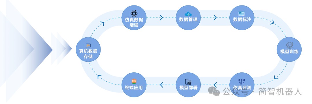 “1”为Gen Matrix数据智能平台中枢,区别于行业仅做数据采集的普遍现状,简智更注重数据提纯与智能转化,可按需完成数据清洗、标注、环境重建及模型评测,自动生成二次数据需求,形成迭代核心引擎。