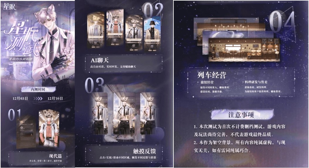 在「星眠」设定里玩家经营着一家在列车上的“梦境旅馆”,唯一男主星眠是一位未来仿生人,同时也是玩家的助理。玩家主要通过AI对话和模拟经营来提升与星眠的好感度,从而实现推进主线剧情及与星眠关系的成长。