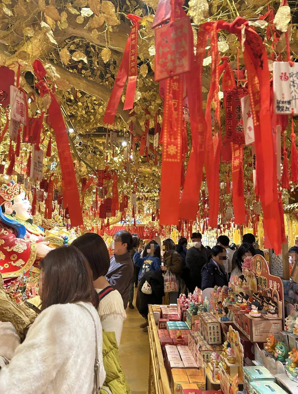 王泽觉得很好玩,顺手抓起两张功德盆里的纸币便与财神像合影,在拍下几十张照片后,他才开始审视店内真正的「正菜」——那些承载着好运寓意的小物件。