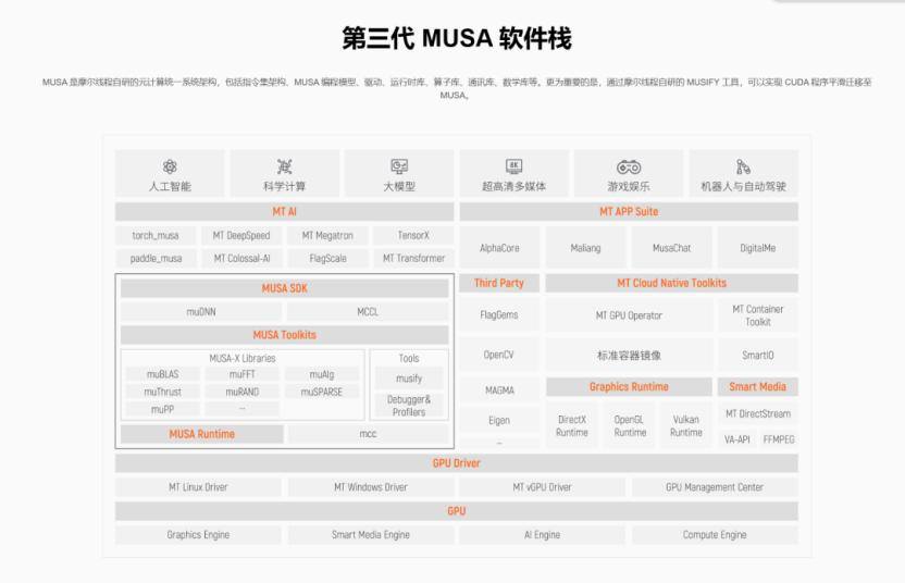 对此,摩尔线程在招股书中提到在核心IP开发方面,公司已经构建涵盖单指令多线程向量计算核心、多精度张量计算核心等在内的完整体系。简单来说,就是GPU最关键的部分都是自己设计的,已经形成一套完整的自研技术体系。
