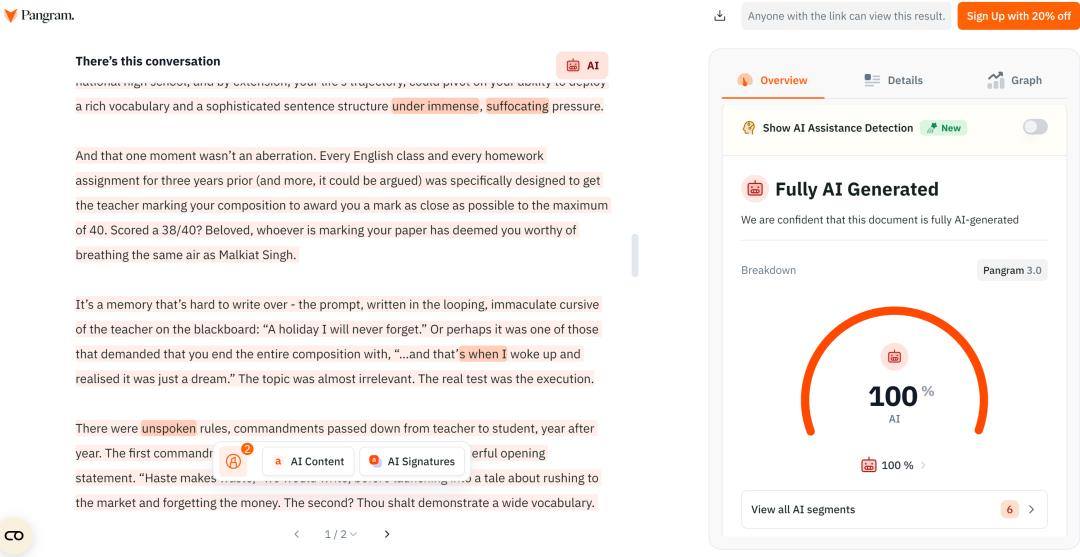不过,令人啼笑皆非的是,小马的这篇感情饱满、“活人感”很强的文章,竟然还是被Pangram网站判定为100%由AI生成。