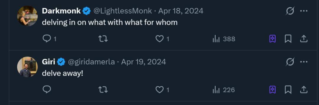 而基于类似理由,人们还发现,ChatGPT似乎对“delve”(挖掘、深入研究)这个词情有独钟。