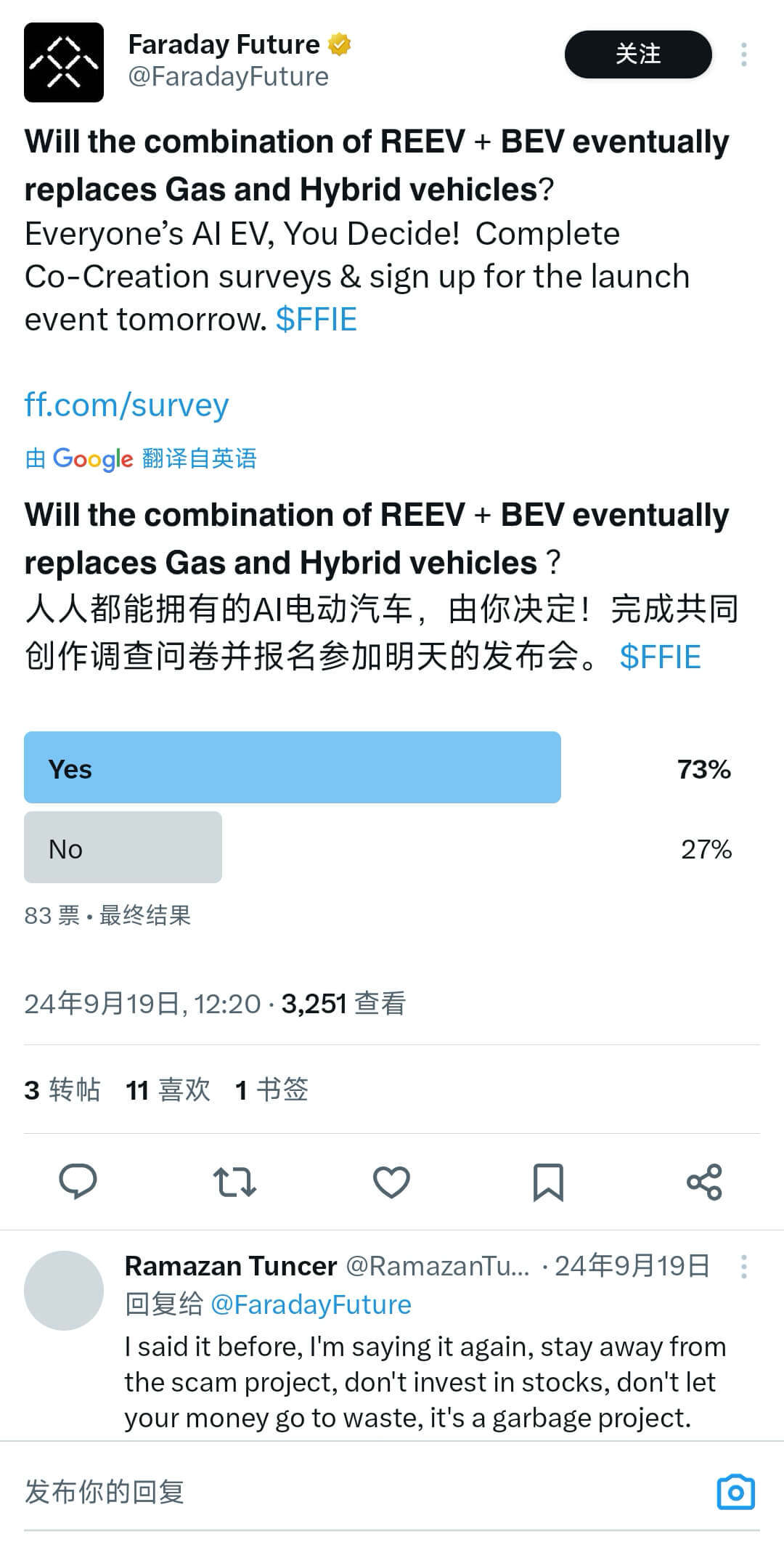 电车通留意到,法拉第未来官方在X平台发布的调查问卷动态,评论区的互动尤为惨淡;贾跃亭的社交平台也是充满各种质疑的声音。