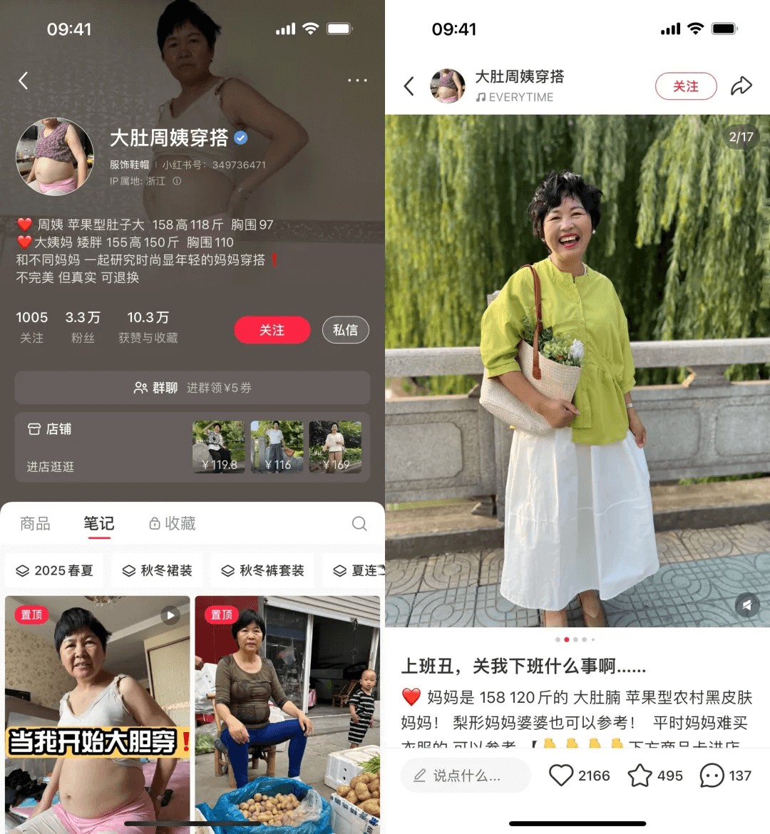 小红书有过数据统计,60岁以上的创作者,过去两年增长三倍,累计发笔记超过1亿篇。举个例子。有位叫@大肚周姨穿搭的用户,她发帖的目的,就是想和网友一起,研究时尚显年轻的妈妈穿搭。