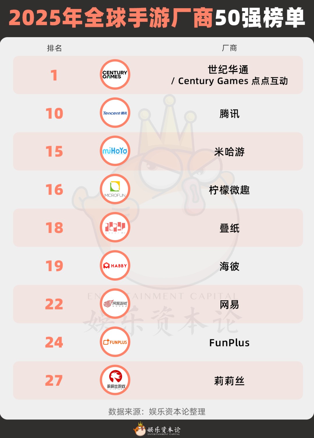 英国老牌游戏媒体PocketGamer.biz发布《2025年全球手游厂商50强榜单》,其中有九家中国企业上榜,分别为世纪华通、腾讯互娱、米哈游、柠檬微趣、叠纸、海彼游戏、网易游戏、FunPlus、莉莉丝游戏。